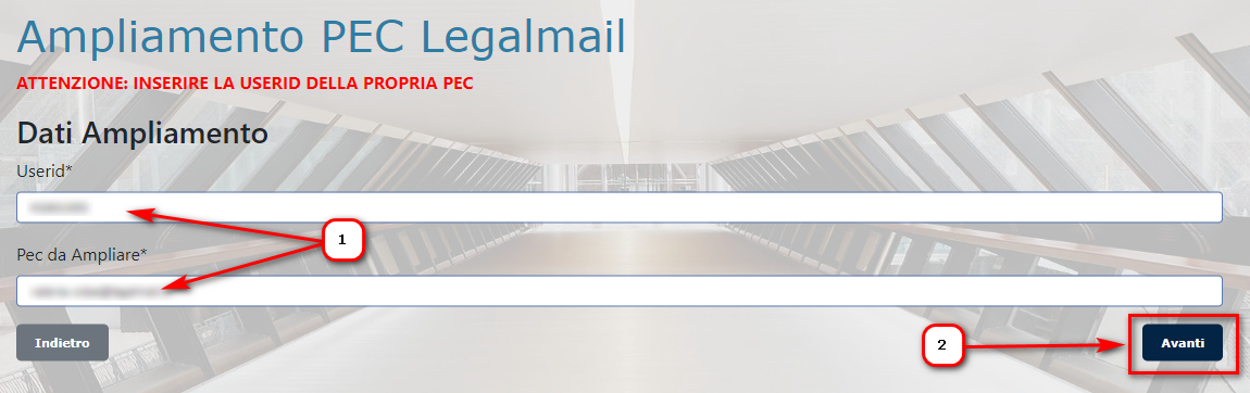 Inserire la userID e l’indirizzo della casella PEC (1) e procedere Avanti (2):