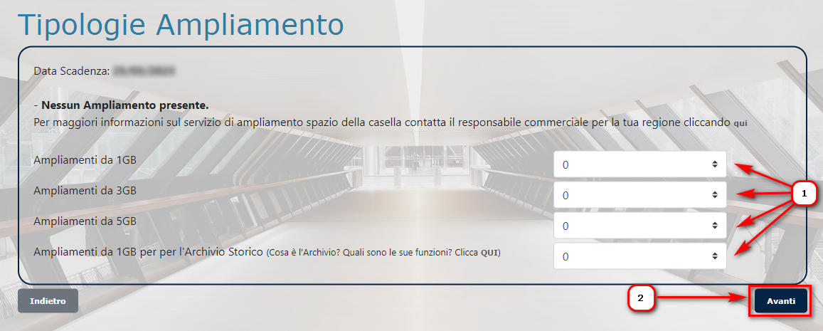 Selezionare l’ampliamento che si desidera acquistare (1) e procedere Avanti (2):