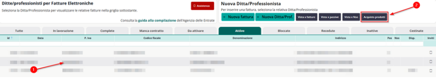 Sarà necessario selezionare, cliccando una volta con il tasto sinistro del mouse, sulla denominazione della DITTA / OPERATORE ECONOMICO (1) che è stato inserito precedentemente e che deve essere nello stato ATTIVO, cliccare sul tasto ACQUISTO PRODOTTI (2) presente in alto a destra: