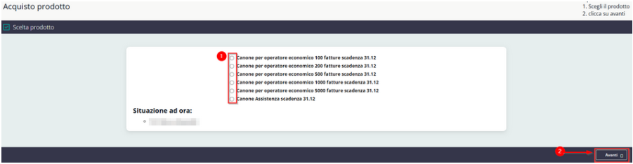 Selezionare il pacchetto di fatture che si desidera acquistare (1) e proseguire cliccando su AVANTI (2):