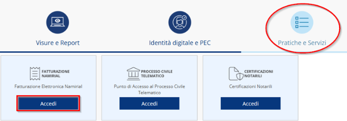 Dopo aver effettuato il login con le proprie credenziali, cliccare sulla voce ACCEDI, presente nel riquadro rinominato Fatturazione Elettronica Namirial nella colonna Pratiche e Servizi: