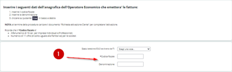 Indicare, dove richiesto, il codice fiscale e la denominazione del soggetto (1), persona fisica o giuridica, da inserire come colui che spedirà le fatture e cliccare su CREA (2) in basso a destra: