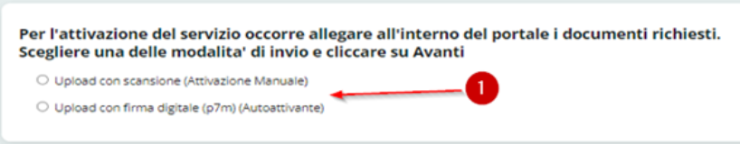 Cliccando su INVIA RICHIESTA, sarà necessario scegliere la modalità di firma che si desidera attuare sui contratti tra: Upload con scansione (Attivazione Manuale) e Upload con firma digitale (p7m) (Autoattivante) – (1) – cliccare infine su CONFERMA in basso a destra per proseguire: