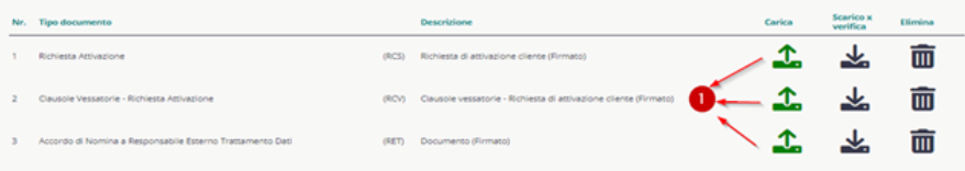 Dopo aver effettuato la firma, nella schermata presente a video, cliccare sull’icona per caricare i documenti (1) per ogni file ed eseguire l’upload dei file firmati. Al termine, cliccare su CONFERMA in basso a destra: