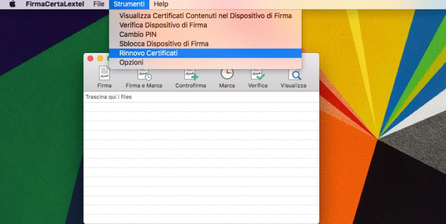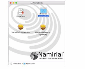 Avviare “FirmaCerta.dmg” e trascinare il file “FirmaCerta” nella cartella “Applicazioni”.