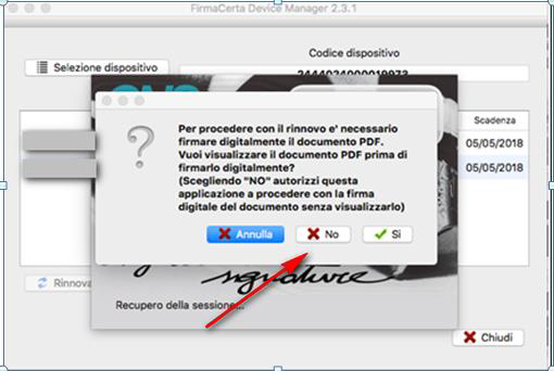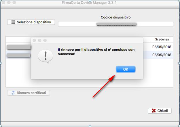 Cliccare sul tasto “No” per proseguire con la procedura e attendere l’esito del processo. Cliccare su “OK” per terminare la procedura dove si visualizzerà il messaggio “Il rinnovo per il dispositivo si è concluso con successo!”