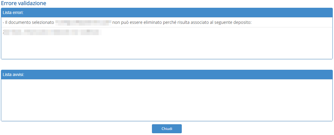 Il messaggio “Il documento selezionato non può essere eliminato perché risulta associato al seguente deposito…” compare quando si tenta di eliminare un documento dalla scheda Documenti del fascicolo, ma il file risulta già allegato a un deposito telematico.