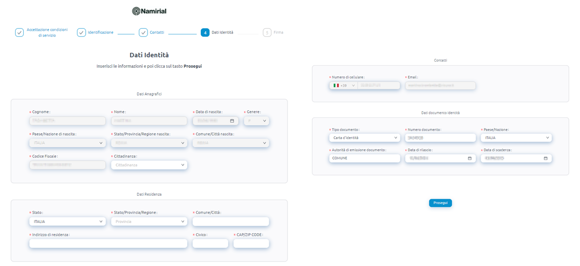 Tutti i dati anagrafici, i contatti e i dati del documento saranno già compilati, il cliente dovrà inserire solamente la cittadinanza e i dati di residenza.